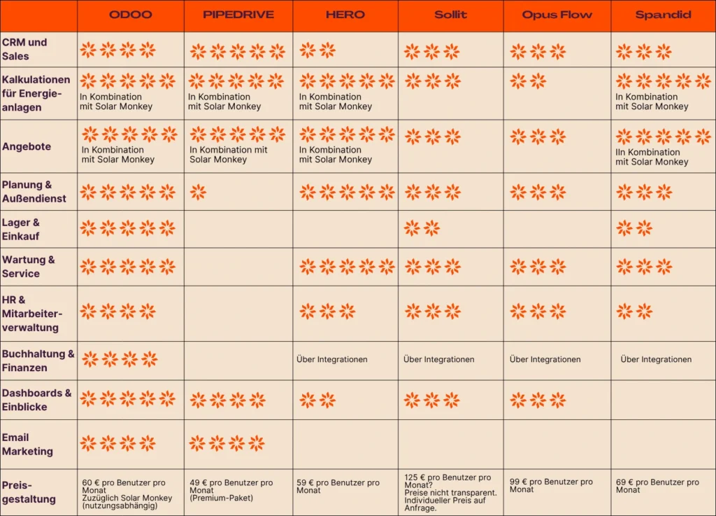 Als Solar Monkey haben wir einen klaren Fokus: Wir möchten das beste Kalkulations- und Angebotswerkzeug für Installateure von Energieprodukten sein. Wir wählen bewusst diese Nische, da uns dieser Fokus hilft, in diesem speziellen Bereich führend zu sein. Jedoch ist der Prozess eines Installateurs viel umfassender, und die Nachfrage nach vollständiger Prozessoptimierung wird häufig an uns herangetragen. Auf diesem Gebiet haben wir auch umfangreiche Erfahrung. Im Folgenden finden Sie eine Auswahl der möglichen CRM- und ERP-Systeme und unsere Sichtweise darauf.